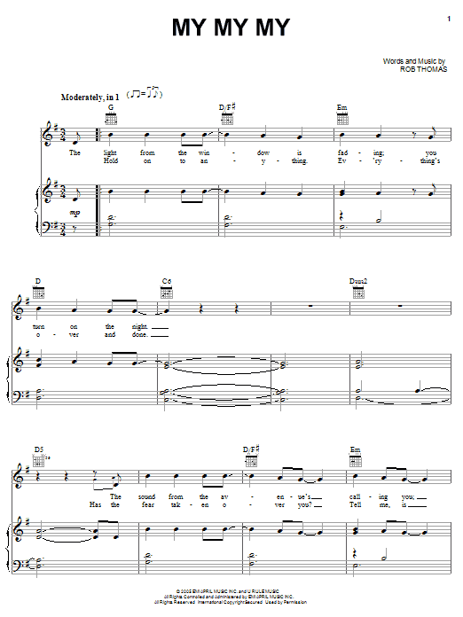 Download or print Rob Thomas My My My sheet music, chords and digital score arranged for Piano, Vocal & Guitar Chords (Right-Hand Melody). This Pop score includes 7 page(s).