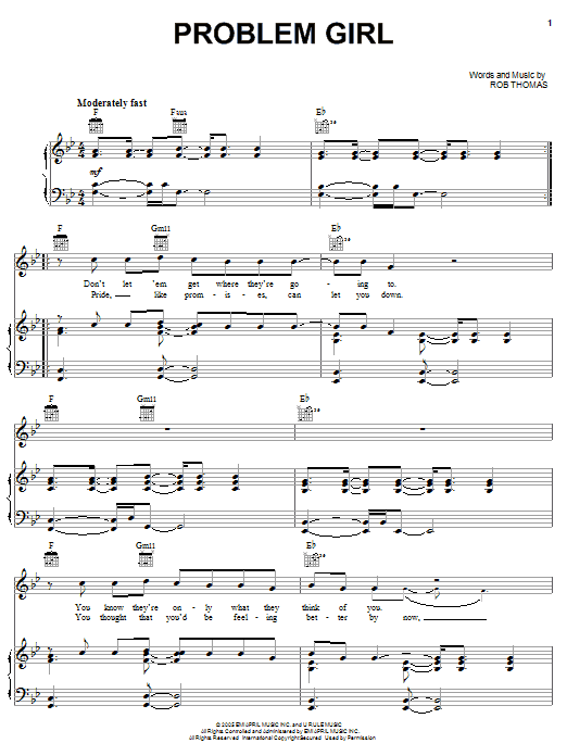 Download or print Rob Thomas Problem Girl sheet music, chords and digital score arranged for Piano, Vocal & Guitar Chords (Right-Hand Melody). This Pop score includes 8 page(s).