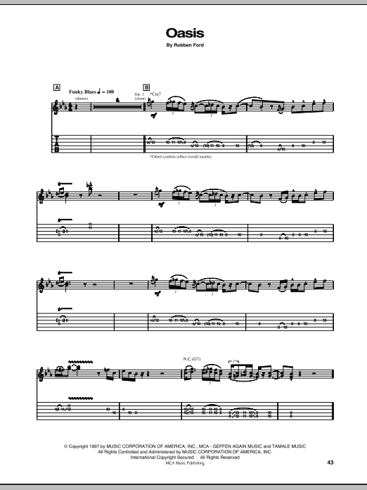 Download or print Robben Ford Oasis sheet music, chords and digital score arranged for Guitar Tab. This Pop score includes 8 page(s).