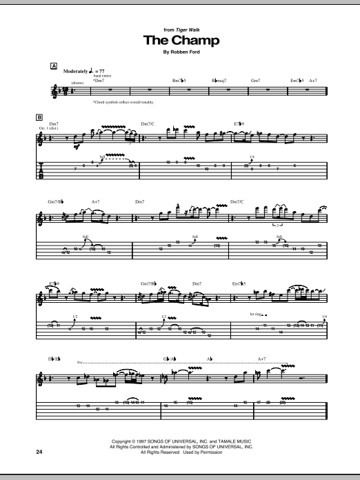 Download or print Robben Ford The Champ sheet music, chords and digital score arranged for Guitar Tab. This Pop score includes 6 page(s).