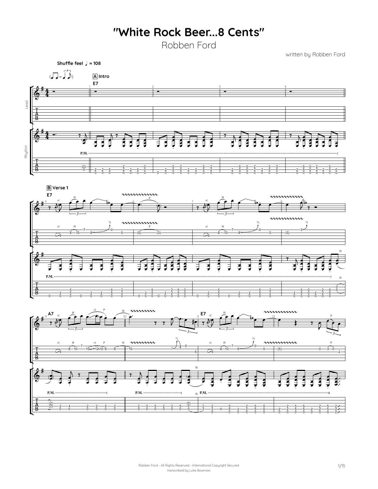 Download or print Robben Ford White Rock Beer...8 cents sheet music, chords and digital score arranged for Guitar Tab. This Jazz score includes 15 page(s).