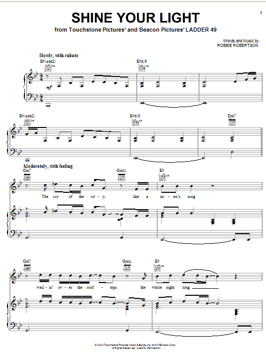 Download or print Robbie Robertson Shine Your Light sheet music, chords and digital score arranged for Piano, Vocal & Guitar Chords (Right-Hand Melody). This Disney score includes 9 page(s).