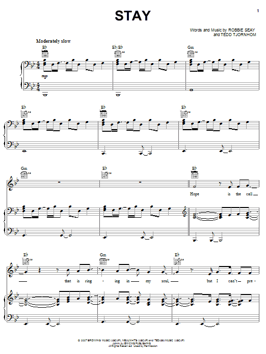Download or print Robbie Seay Band Stay sheet music, chords and digital score arranged for Piano, Vocal & Guitar Chords (Right-Hand Melody). This Christian score includes 7 page(s).