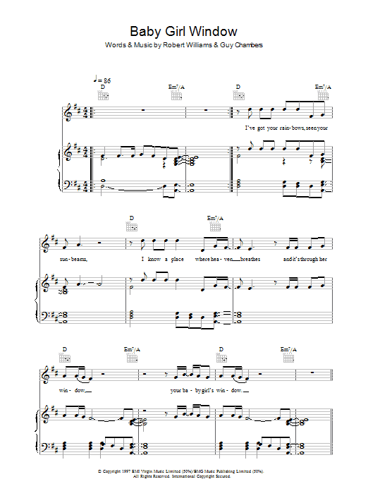Download or print Robbie Williams Baby Girl Window sheet music, chords and digital score arranged for Piano, Vocal & Guitar Chords. This Pop score includes 5 page(s).