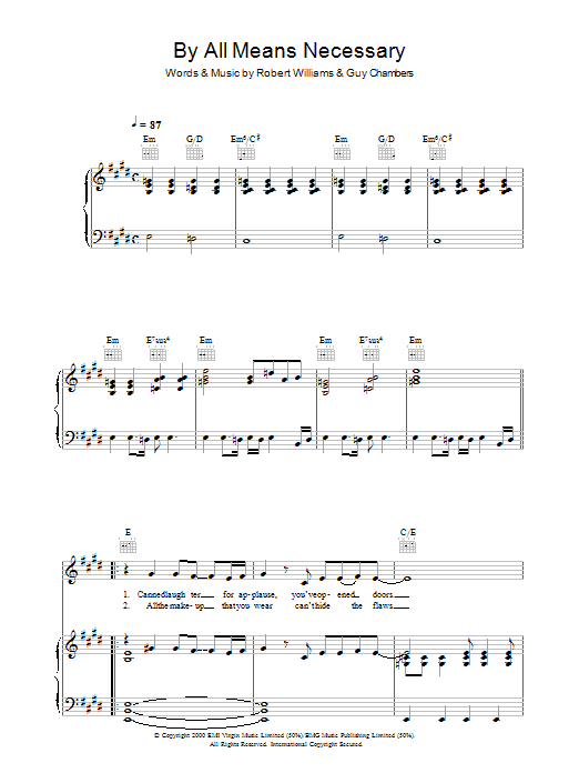 Download or print Robbie Williams By All Means Necessary sheet music, chords and digital score arranged for Piano, Vocal & Guitar Chords. This Pop score includes 8 page(s).