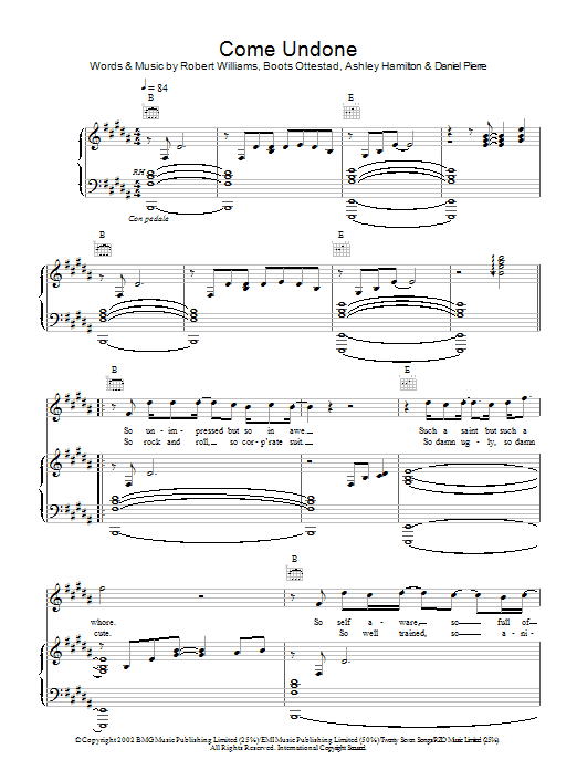 Download or print Robbie Williams Come Undone sheet music, chords and digital score arranged for Piano Solo. This Pop score includes 5 page(s).