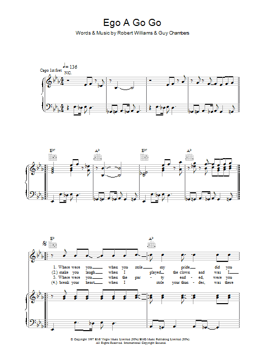 Download or print Robbie Williams Ego A Go Go sheet music, chords and digital score arranged for Piano, Vocal & Guitar Chords. This Pop score includes 7 page(s).