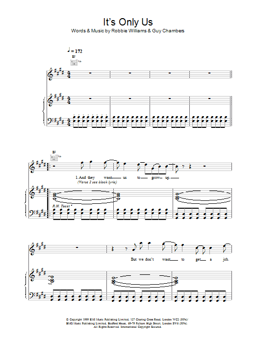Download or print Robbie Williams It's Only Us sheet music, chords and digital score arranged for Piano Chords/Lyrics. This Pop score includes 2 page(s).