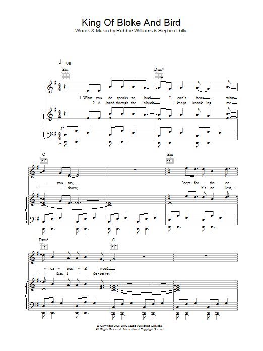 Download or print Robbie Williams King Of Bloke And Bird sheet music, chords and digital score arranged for Piano, Vocal & Guitar Chords. This Pop score includes 5 page(s).
