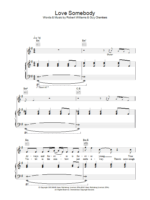 Download or print Robbie Williams Love Somebody sheet music, chords and digital score arranged for Lyrics Only. This Pop score includes 2 page(s).