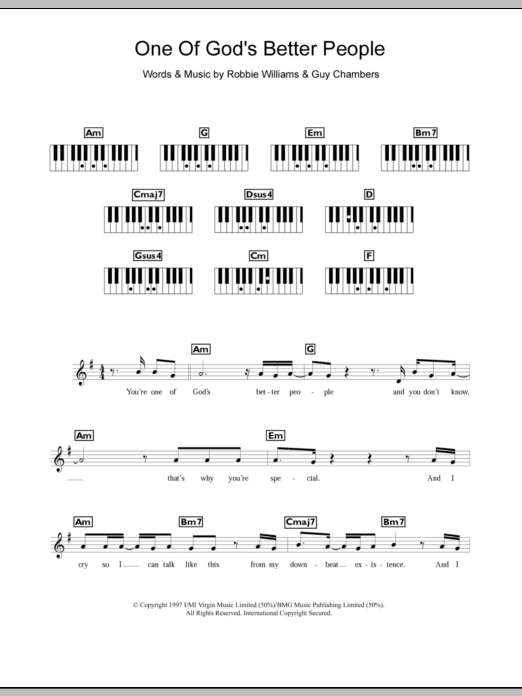 Download or print Robbie Williams One Of God's Better People sheet music, chords and digital score arranged for Piano, Vocal & Guitar Chords. This Pop score includes 6 page(s).
