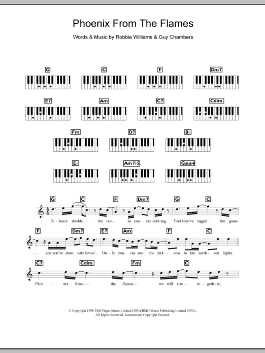 Download or print Robbie Williams Phoenix From The Flames sheet music, chords and digital score arranged for Piano, Vocal & Guitar Chords. This Pop score includes 7 page(s).