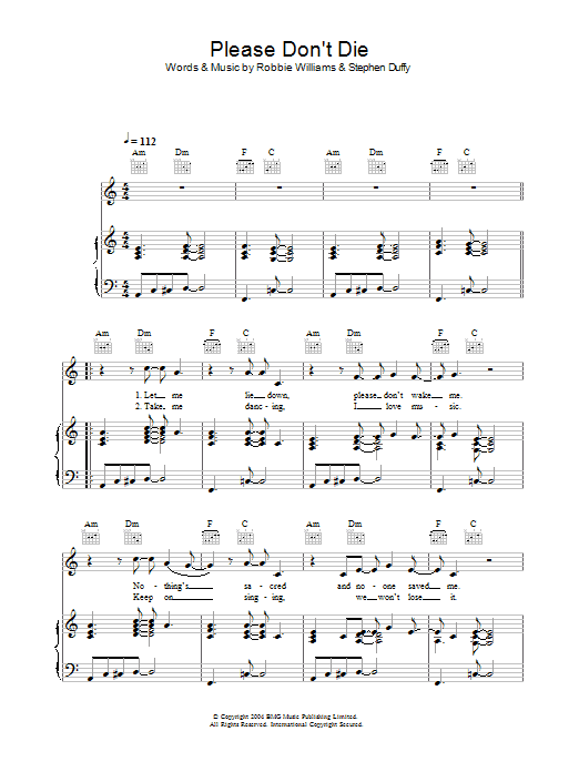 Download or print Robbie Williams Please Don't Die sheet music, chords and digital score arranged for Piano, Vocal & Guitar Chords. This Pop score includes 5 page(s).