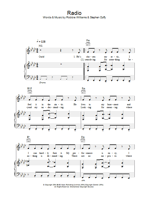 Download or print Robbie Williams Radio sheet music, chords and digital score arranged for Piano Chords/Lyrics. This Pop score includes 2 page(s).