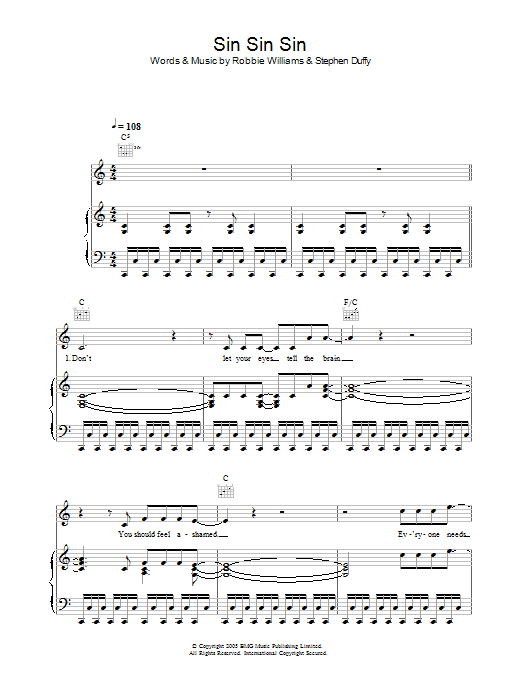 Download or print Robbie Williams Sin Sin Sin sheet music, chords and digital score arranged for Piano, Vocal & Guitar Chords. This Pop score includes 7 page(s).