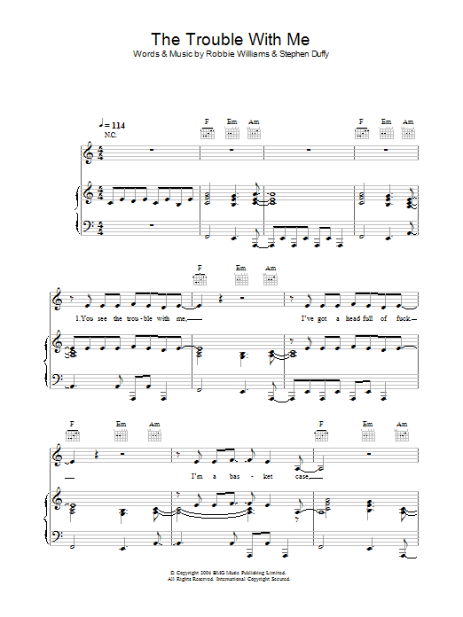 Download or print Robbie Williams The Trouble With Me sheet music, chords and digital score arranged for Piano, Vocal & Guitar Chords. This Pop score includes 6 page(s).