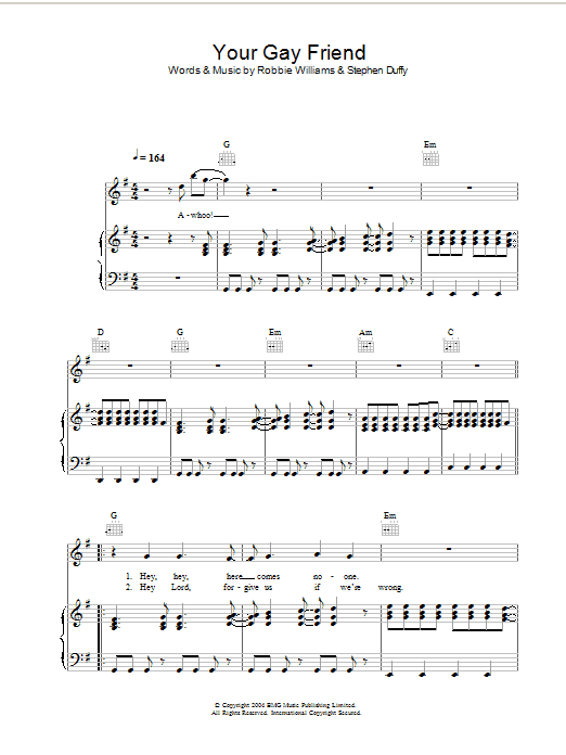 Download or print Robbie Williams Your Gay Friend sheet music, chords and digital score arranged for Piano, Vocal & Guitar Chords. This Pop score includes 6 page(s).