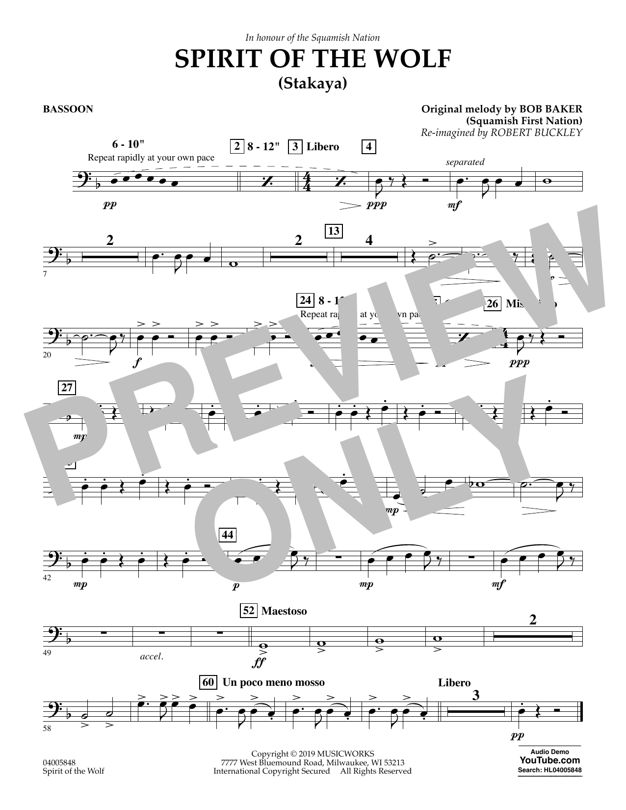 Download or print Robert Buckley Spirit of the Wolf (Stakaya) - Bassoon sheet music, chords and digital score arranged for Concert Band. This Concert score includes 1 page(s).