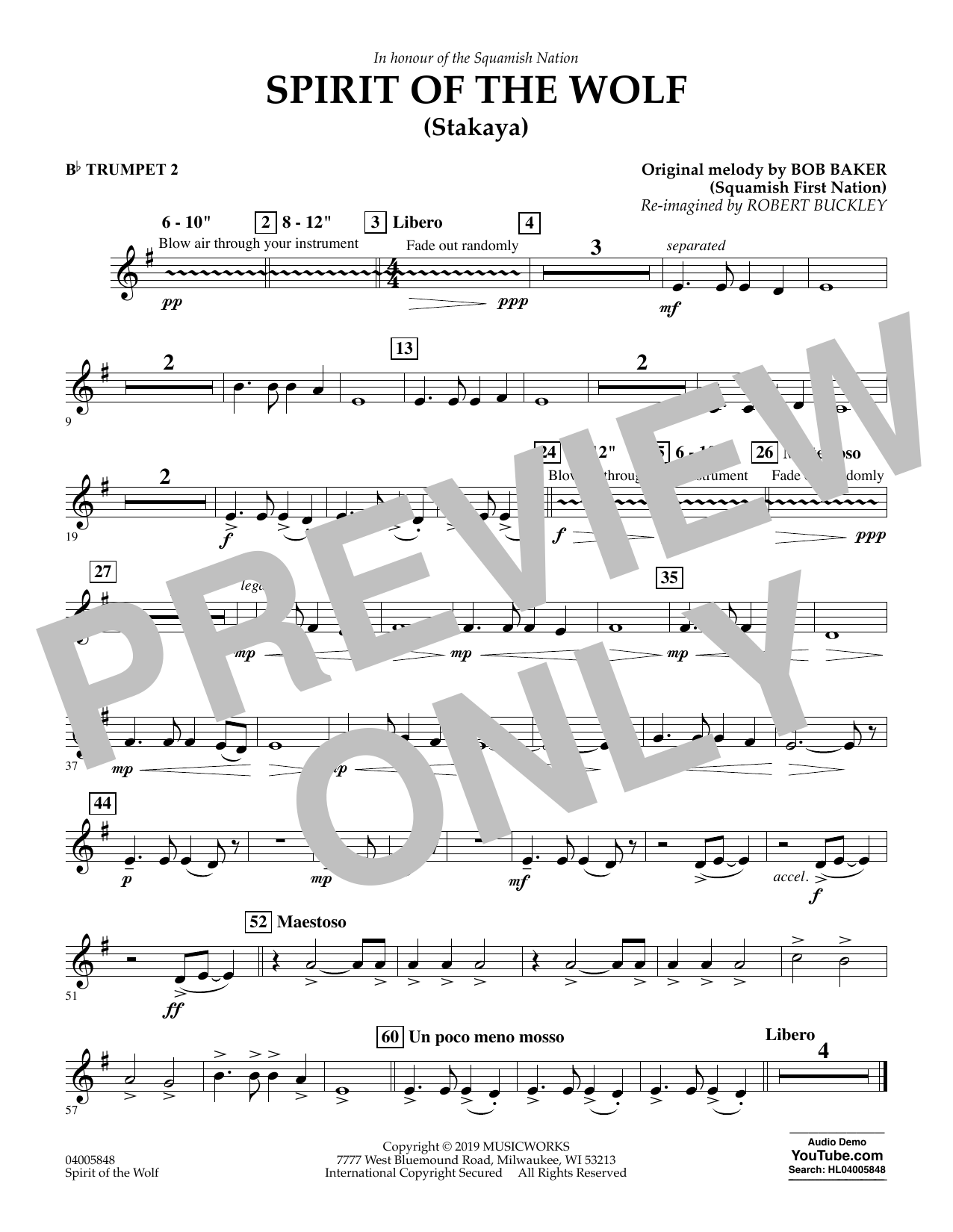 Download or print Robert Buckley Spirit of the Wolf (Stakaya) - Bb Trumpet 2 sheet music, chords and digital score arranged for Concert Band. This Concert score includes 1 page(s).