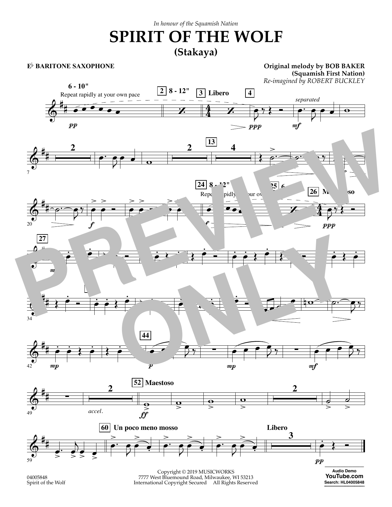 Download or print Robert Buckley Spirit of the Wolf (Stakaya) - Eb Baritone Saxophone sheet music, chords and digital score arranged for Concert Band. This Concert score includes 1 page(s).