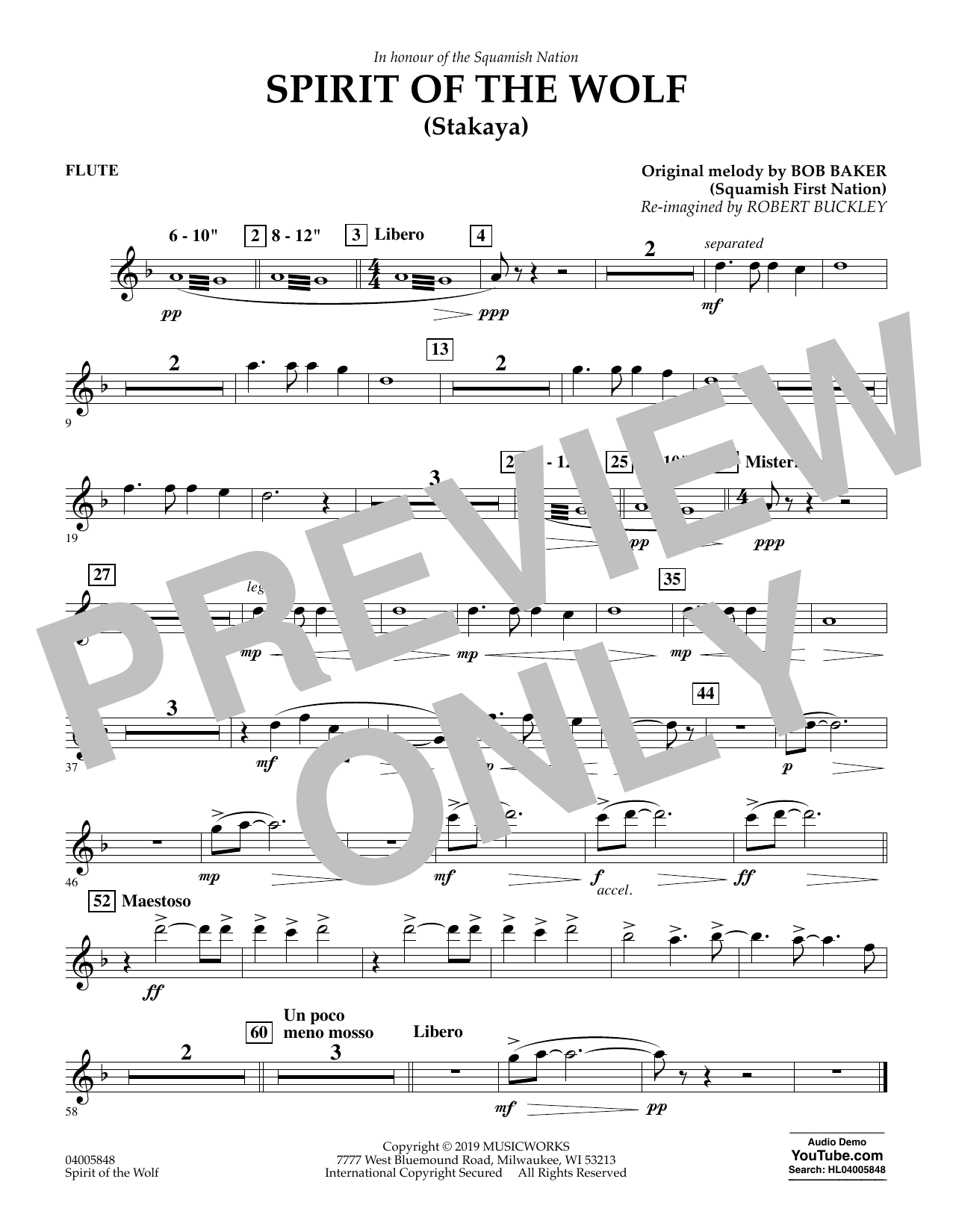 Download or print Robert Buckley Spirit of the Wolf (Stakaya) - Flute sheet music, chords and digital score arranged for Concert Band. This Concert score includes 1 page(s).