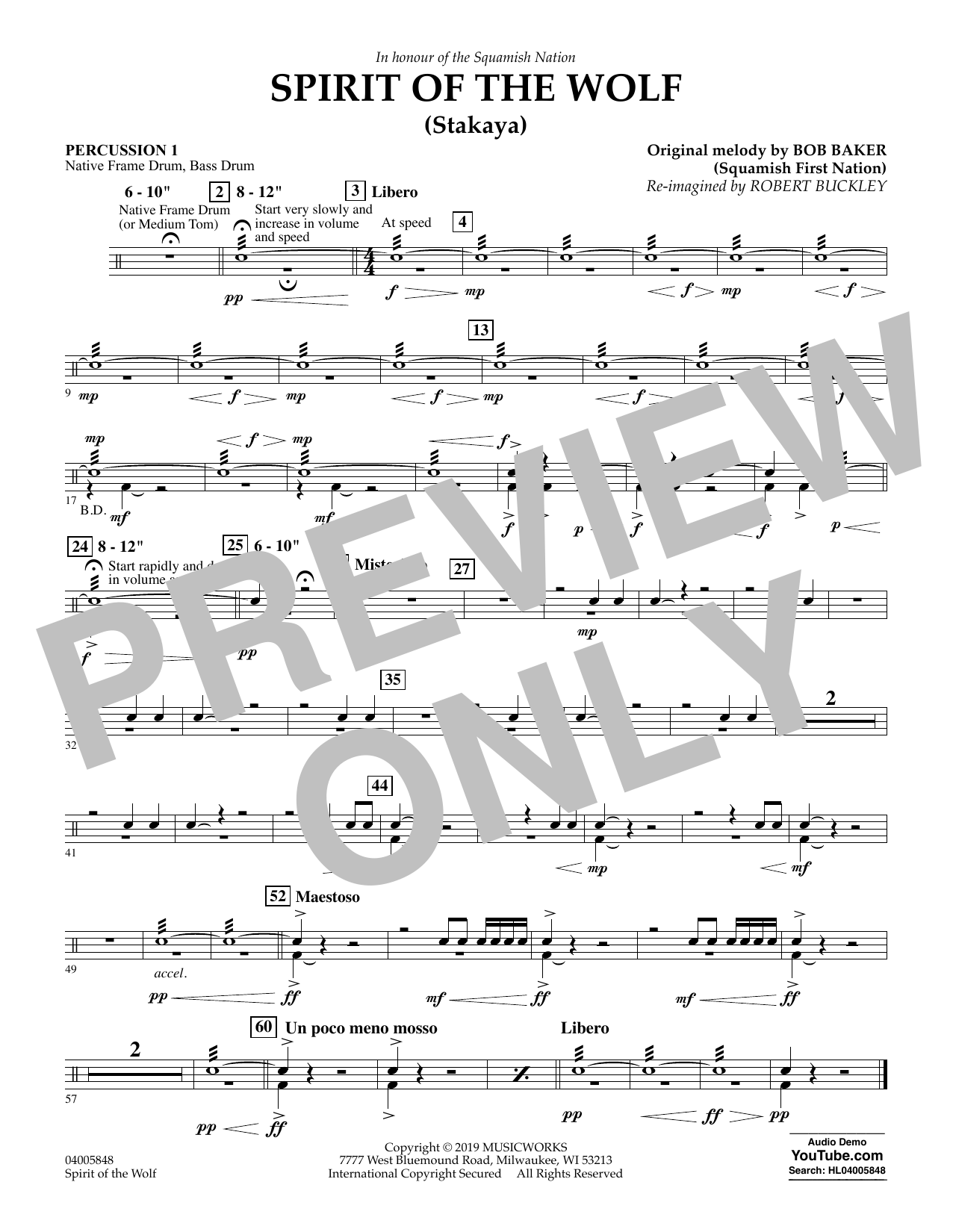 Download or print Robert Buckley Spirit of the Wolf (Stakaya) - Percussion 1 sheet music, chords and digital score arranged for Concert Band. This Concert score includes 1 page(s).