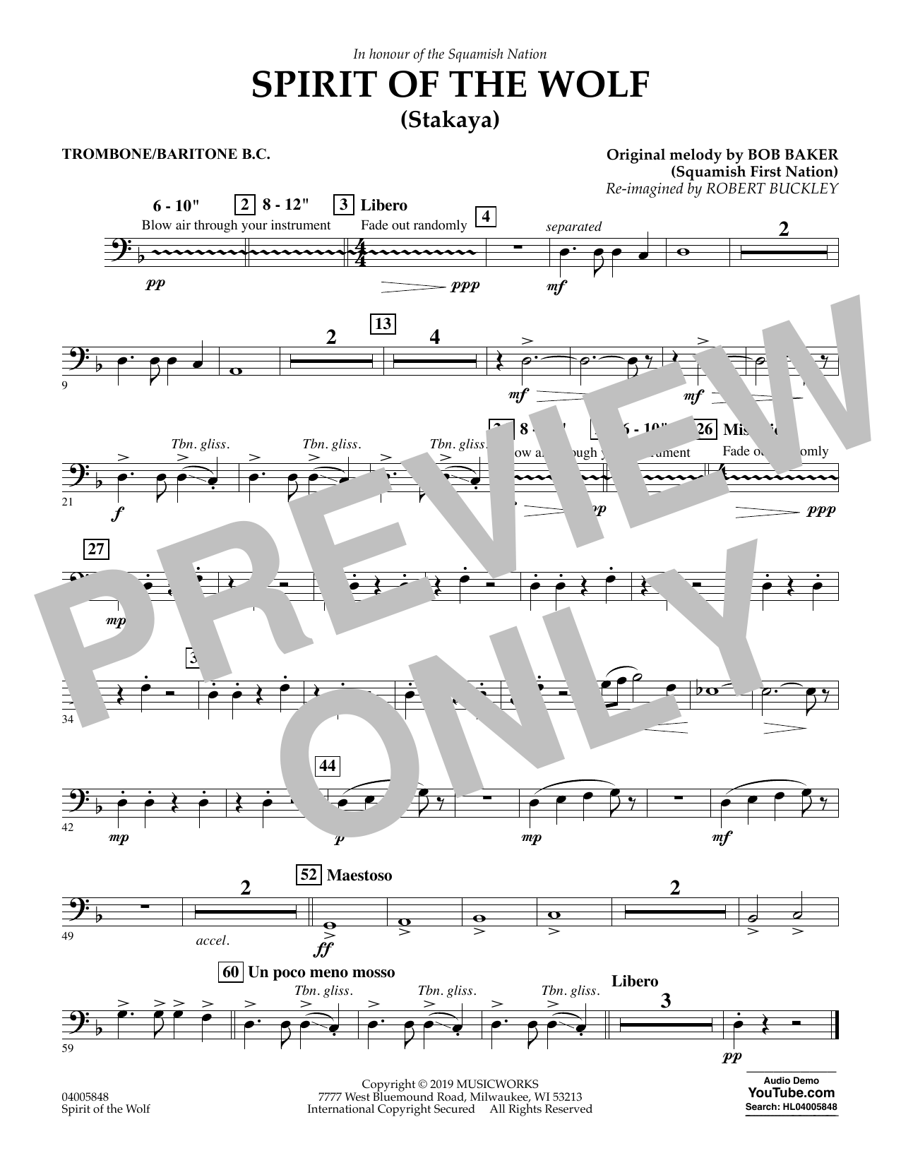 Download or print Robert Buckley Spirit of the Wolf (Stakaya) - Trombone/Baritone B.C. sheet music, chords and digital score arranged for Concert Band. This Concert score includes 1 page(s).