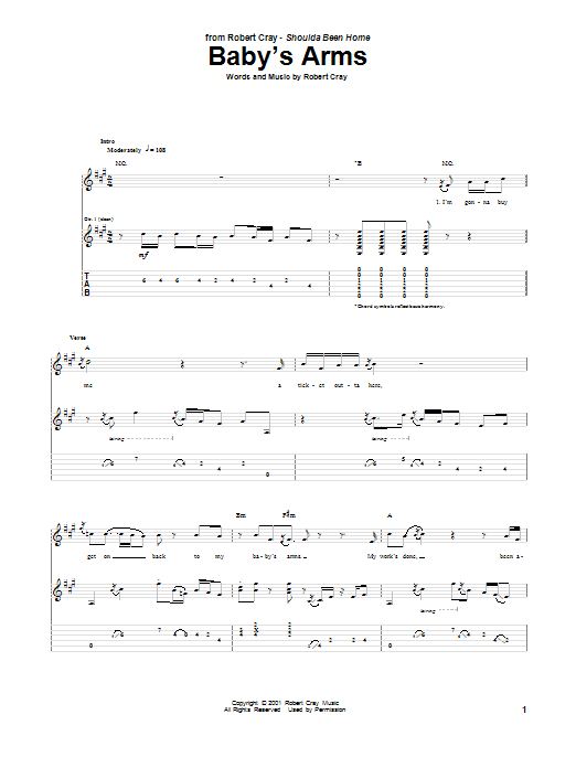 Download or print Robert Cray Baby's Arms sheet music, chords and digital score arranged for Guitar Tab. This Blues score includes 9 page(s).