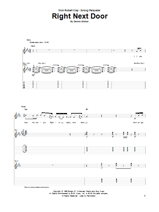 Download or print Robert Cray Right Next Door sheet music, chords and digital score arranged for Guitar Tab. This Blues score includes 18 page(s).