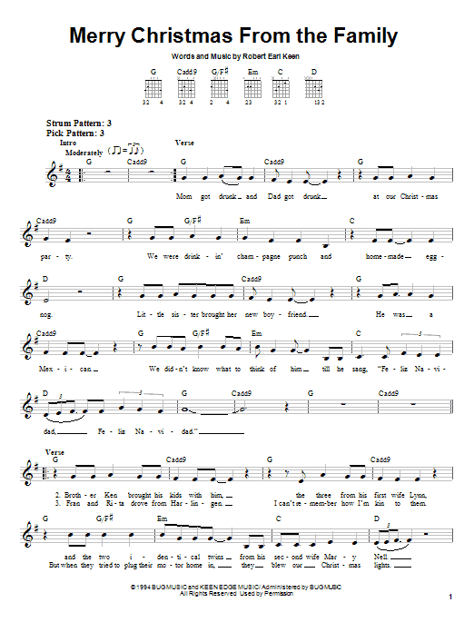 Download or print Robert Earl Keen Merry Christmas From The Family sheet music, chords and digital score arranged for ChordBuddy. This Christmas score includes 2 page(s).