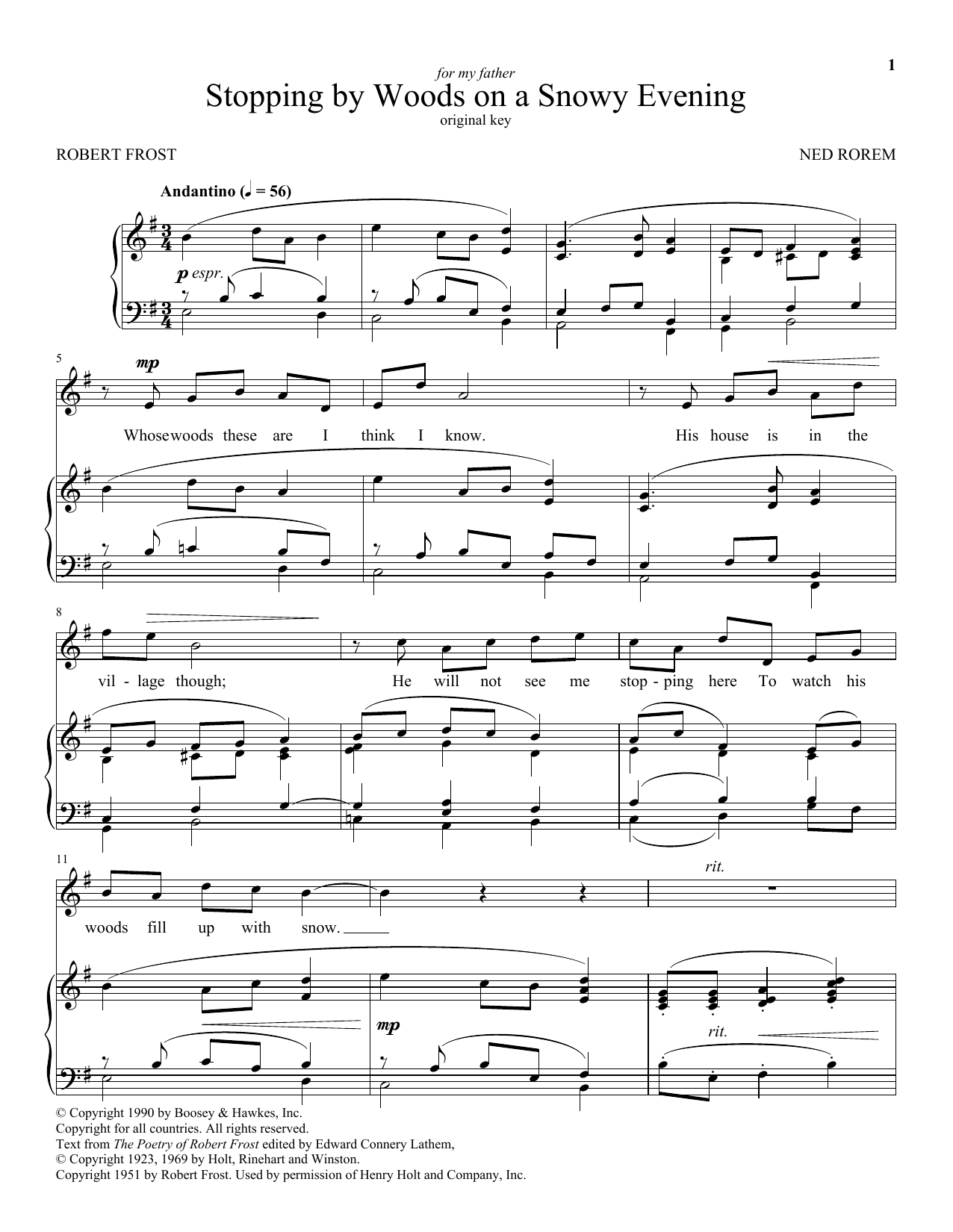 Download or print Robert Frost Stopping By Woods On A Snowy Evening sheet music, chords and digital score arranged for Piano & Vocal. This Classical score includes 3 page(s).