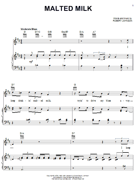 Download or print Robert Johnson Malted Milk sheet music, chords and digital score arranged for Piano, Vocal & Guitar Chords (Right-Hand Melody). This Blues score includes 6 page(s).