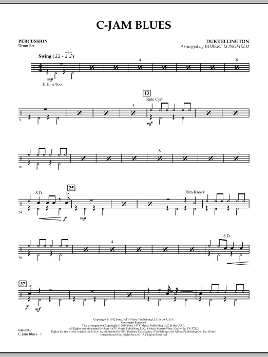 Download or print Robert Longfield C-Jam Blues - Percussion sheet music, chords and digital score arranged for Orchestra. This Jazz score includes 2 page(s).