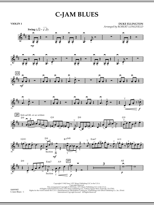 Download or print Robert Longfield C-Jam Blues - Violin 1 sheet music, chords and digital score arranged for Orchestra. This Jazz score includes 2 page(s).