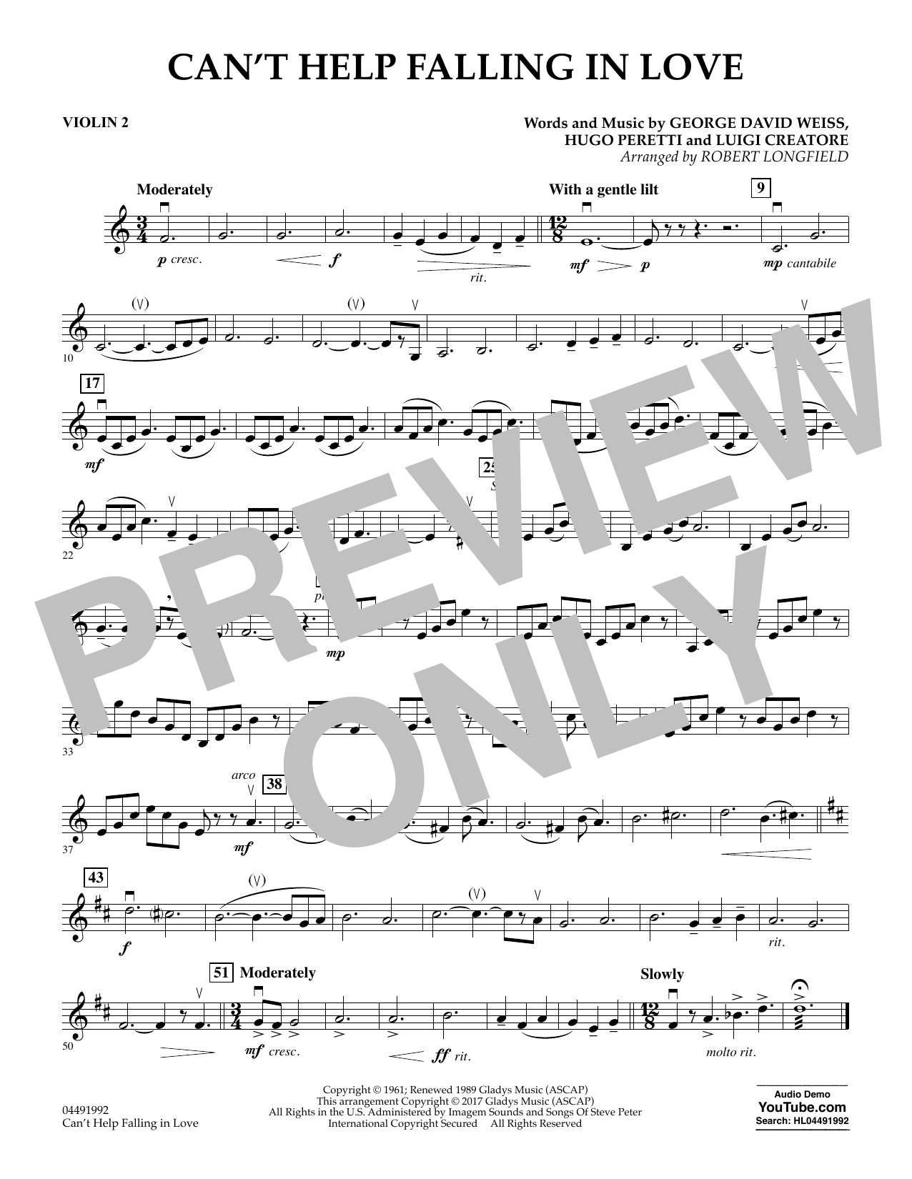 Download or print Robert Longfield Can't Help Falling in Love - Violin 2 sheet music, chords and digital score arranged for Orchestra. This Pop score includes 1 page(s).