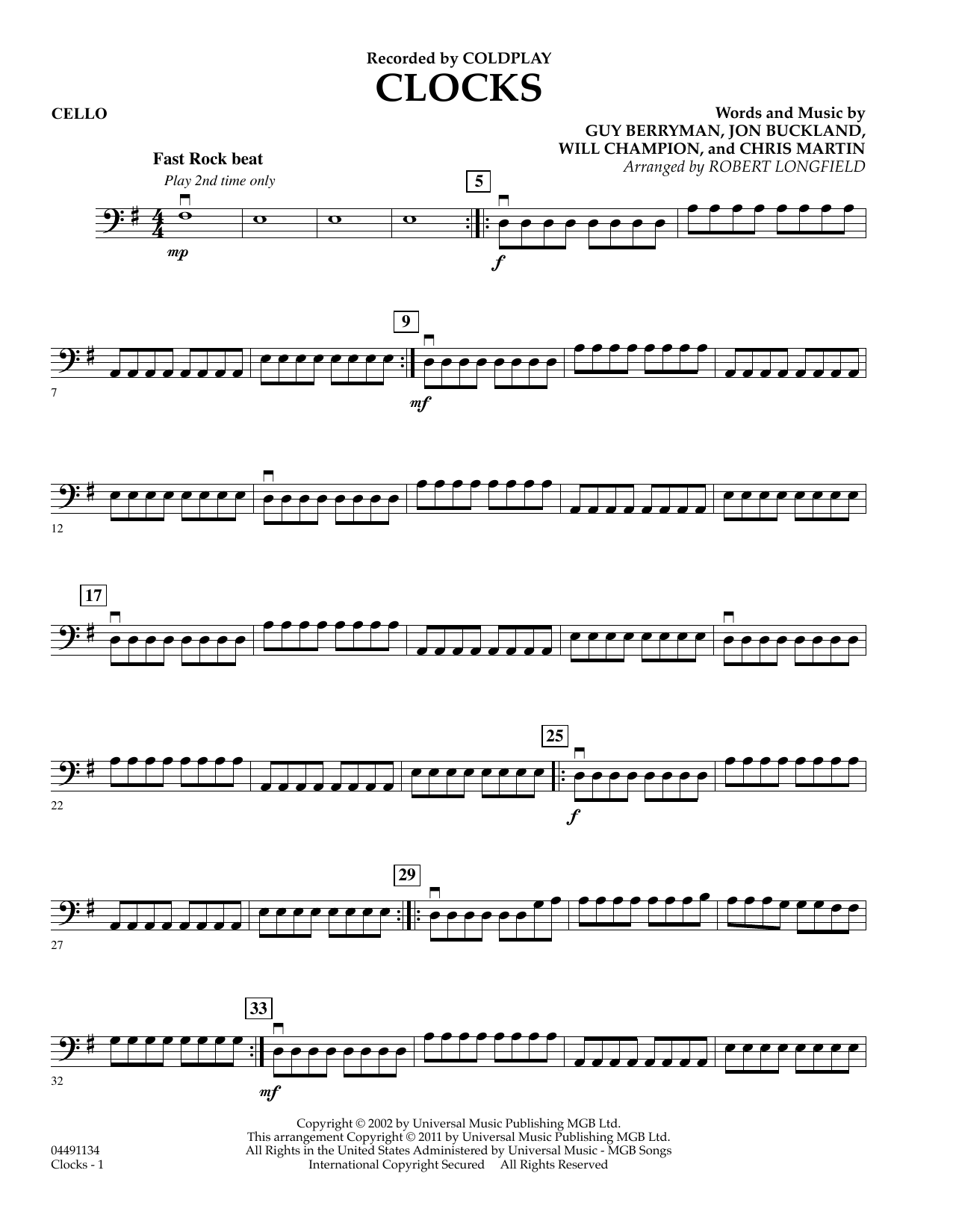 Download or print Robert Longfield Clocks - Cello sheet music, chords and digital score arranged for String Quartet. This Pop score includes 2 page(s).