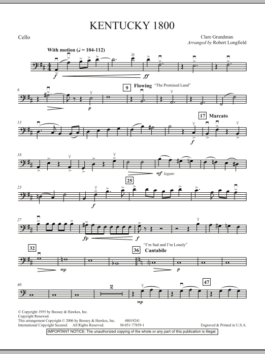 Download or print Robert Longfield Kentucky 1800 - Cello sheet music, chords and digital score arranged for Orchestra. This Folk score includes 2 page(s).