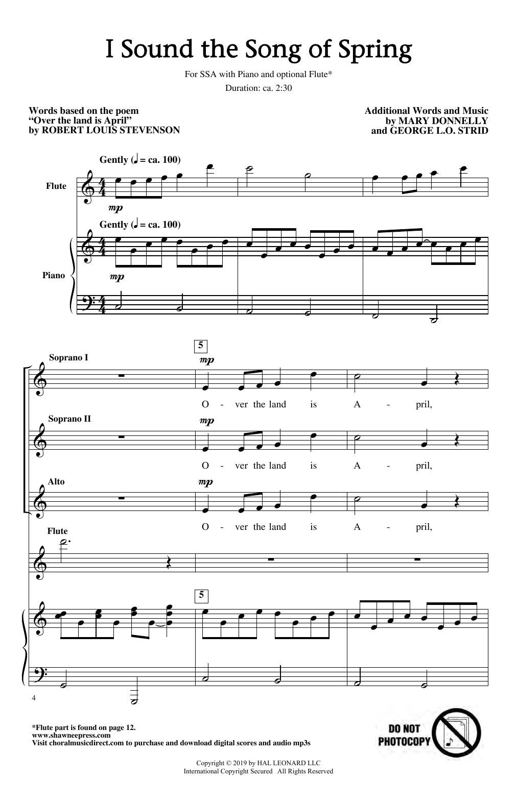 Download or print Robert Louis Stevenson I Sound The Song Of Spring sheet music, chords and digital score arranged for SSA Choir. This Concert score includes 11 page(s).