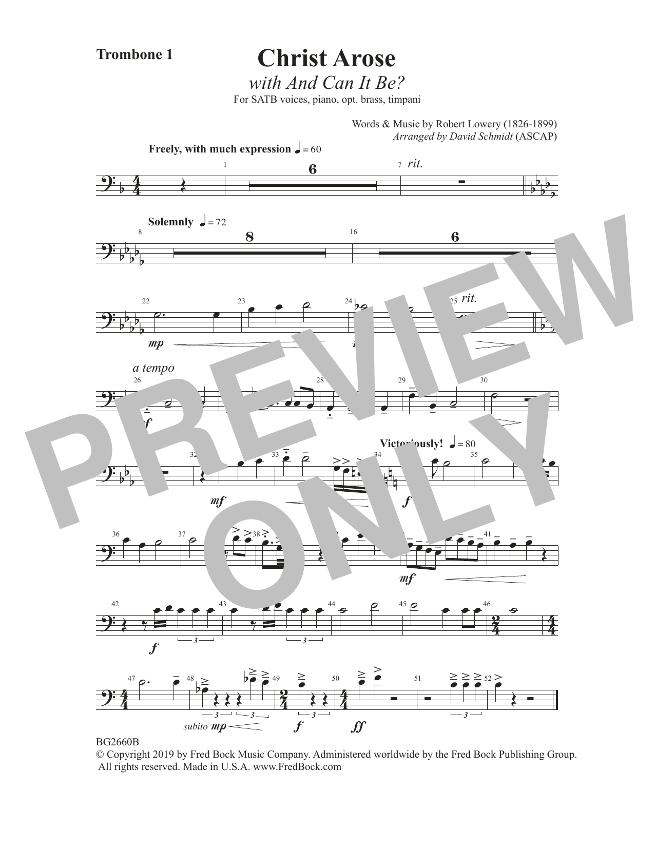 Download or print Robert Lowry Christ Arose (with And Can It Be?) (arr. David Schmidt) - Trombone 1 sheet music, chords and digital score arranged for Choir Instrumental Pak. This Easter score includes 1 page(s).