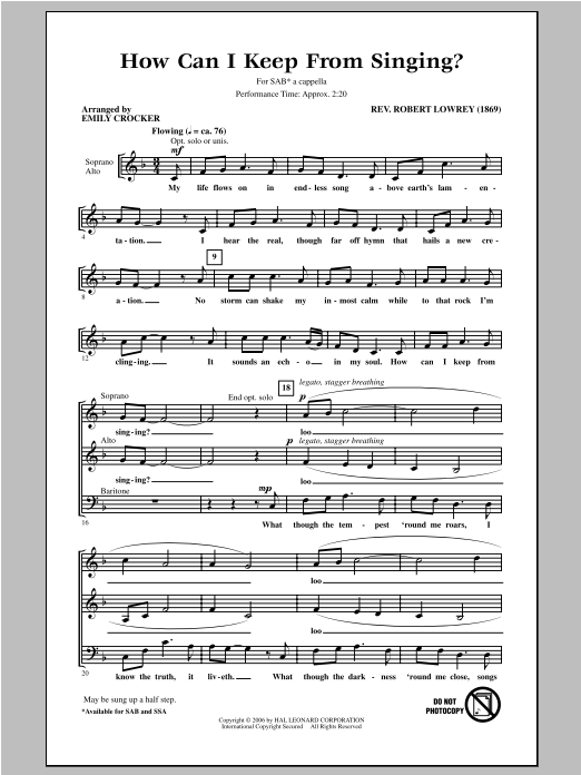 Download or print Emily Crocker How Can I Keep From Singing sheet music, chords and digital score arranged for SAB Choir. This Folk score includes 3 page(s).