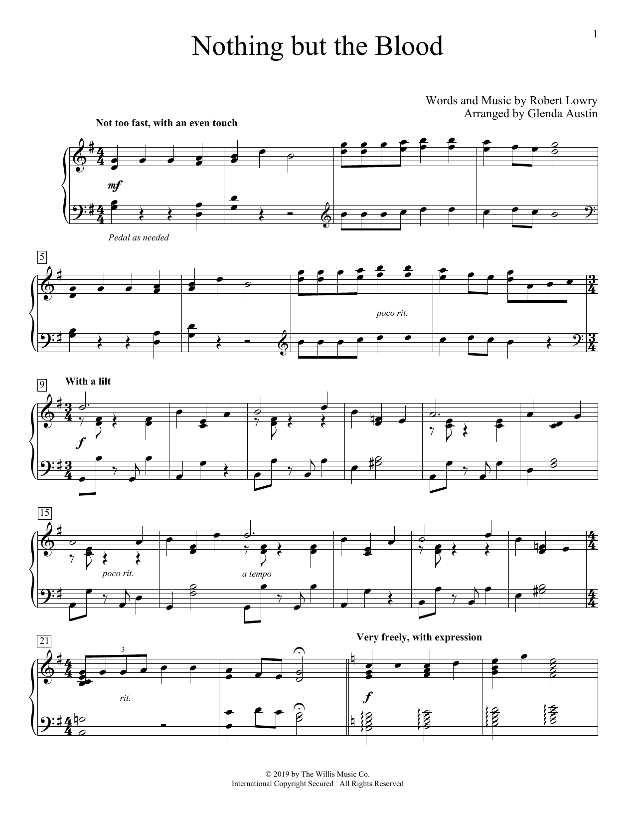 Download or print Robert Lowry Nothing But The Blood (arr. Glenda Austin) sheet music, chords and digital score arranged for Educational Piano. This Hymn score includes 2 page(s).