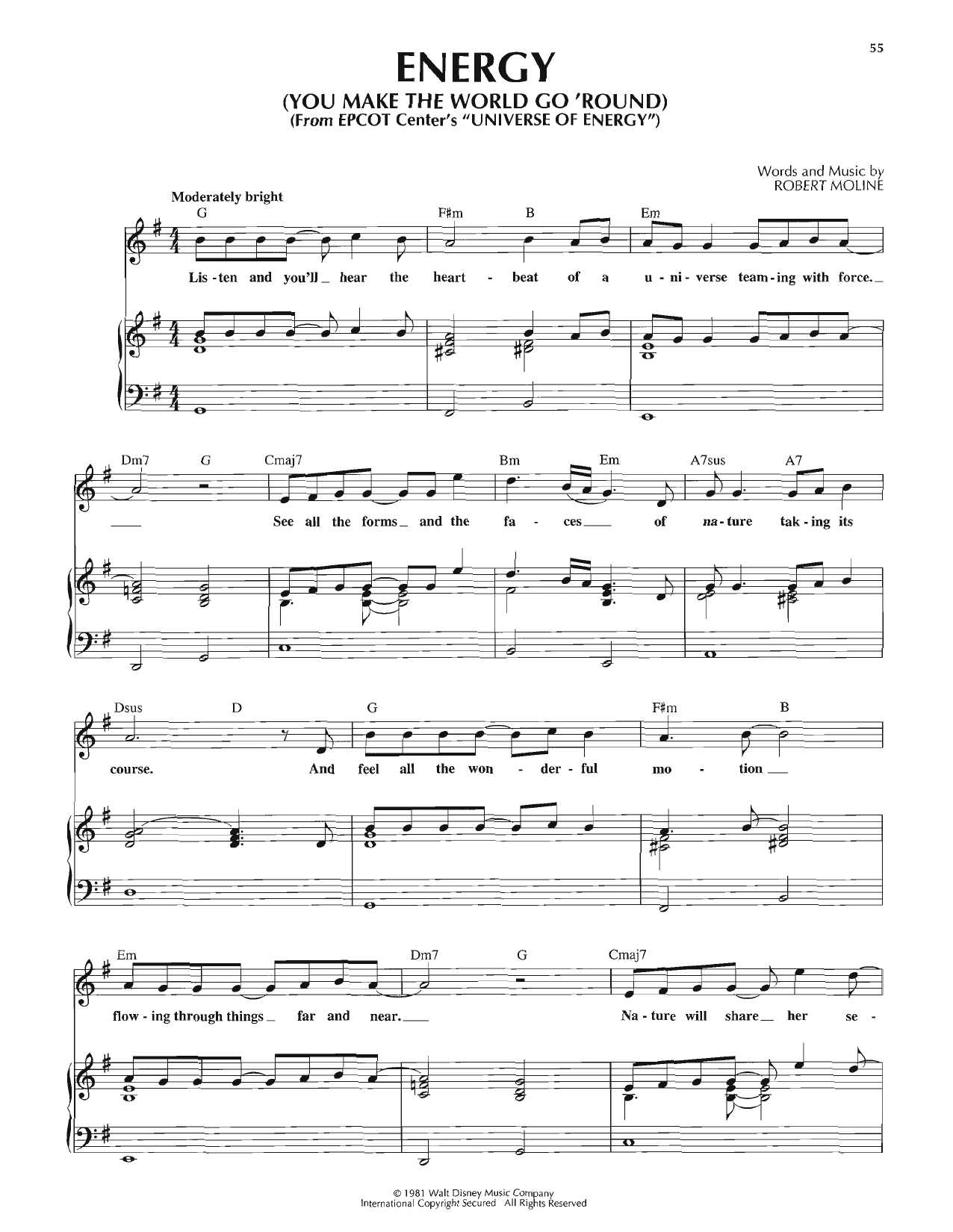 Download or print Robert Moline Energy (You Make The World Go 'Round) sheet music, chords and digital score arranged for Piano, Vocal & Guitar Chords (Right-Hand Melody). This Children score includes 3 page(s).