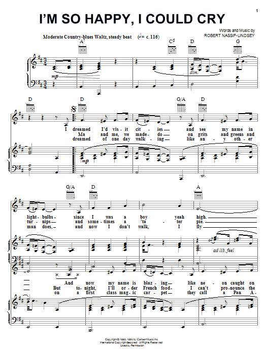 Download or print Robert Nassif-Lindsey I'm So Happy, I Could Cry sheet music, chords and digital score arranged for Piano, Vocal & Guitar Chords (Right-Hand Melody). This Pop score includes 4 page(s).
