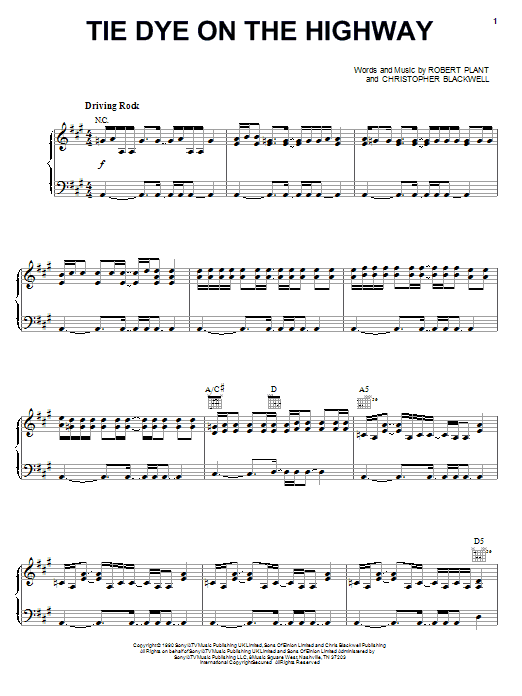 Download or print Robert Plant Tie Dye On The Highway sheet music, chords and digital score arranged for Piano, Vocal & Guitar Chords (Right-Hand Melody). This Pop score includes 8 page(s).