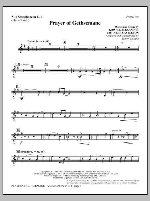 Download or print Robert Sterling Prayer Of Gethsemane - Alto Sax 1 (sub. Horn 1) sheet music, chords and digital score arranged for Choir Instrumental Pak. This Easter score includes 2 page(s).