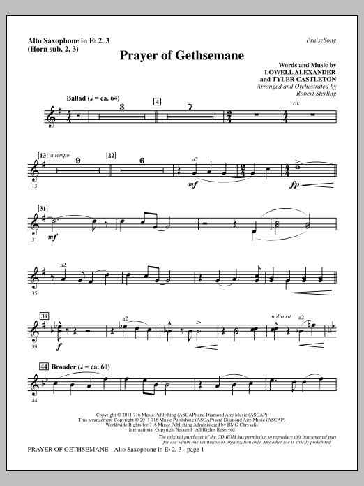 Download or print Robert Sterling Prayer Of Gethsemane - Alto Sax 2-3 (sub. Horn 2-3) sheet music, chords and digital score arranged for Choir Instrumental Pak. This Easter score includes 2 page(s).