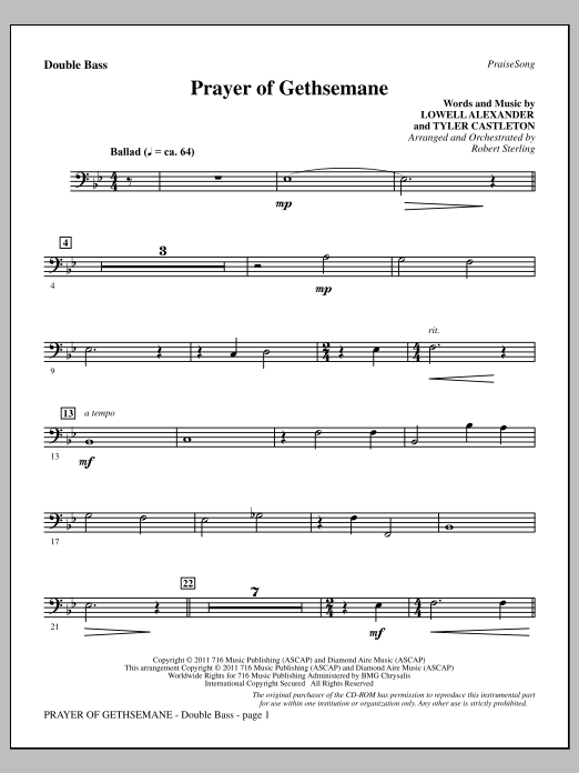 Download or print Robert Sterling Prayer Of Gethsemane - Double Bass sheet music, chords and digital score arranged for Choir Instrumental Pak. This Easter score includes 2 page(s).