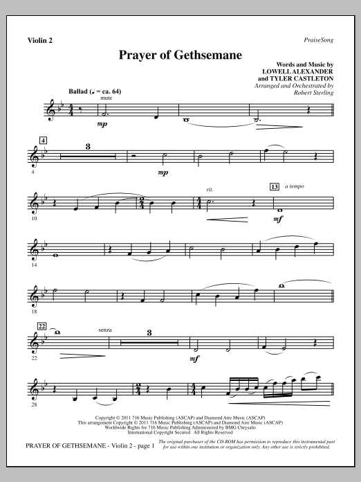 Download or print Robert Sterling Prayer Of Gethsemane - Violin 2 sheet music, chords and digital score arranged for Choir Instrumental Pak. This Easter score includes 2 page(s).
