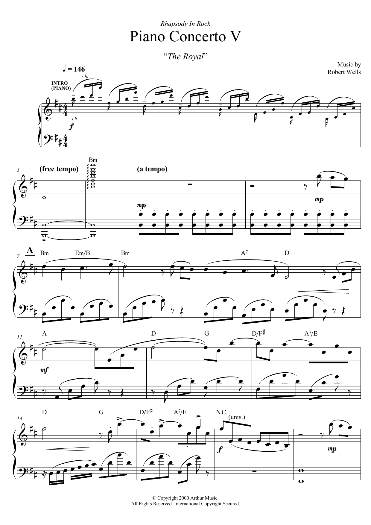 Download or print Robert Wells Piano Concerto: V. The Royal sheet music, chords and digital score arranged for Piano Solo. This Classical score includes 9 page(s).