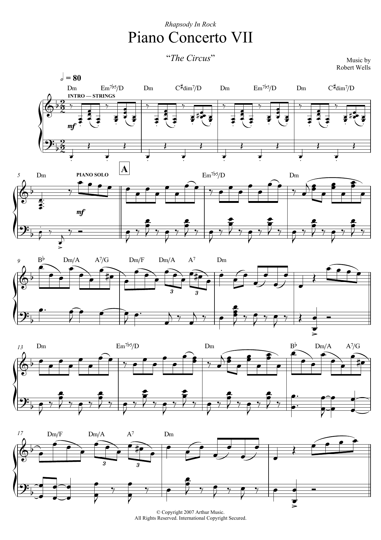 Download or print Robert Wells Piano Concerto: VII. The Circus sheet music, chords and digital score arranged for Piano Solo. This Rock score includes 8 page(s).
